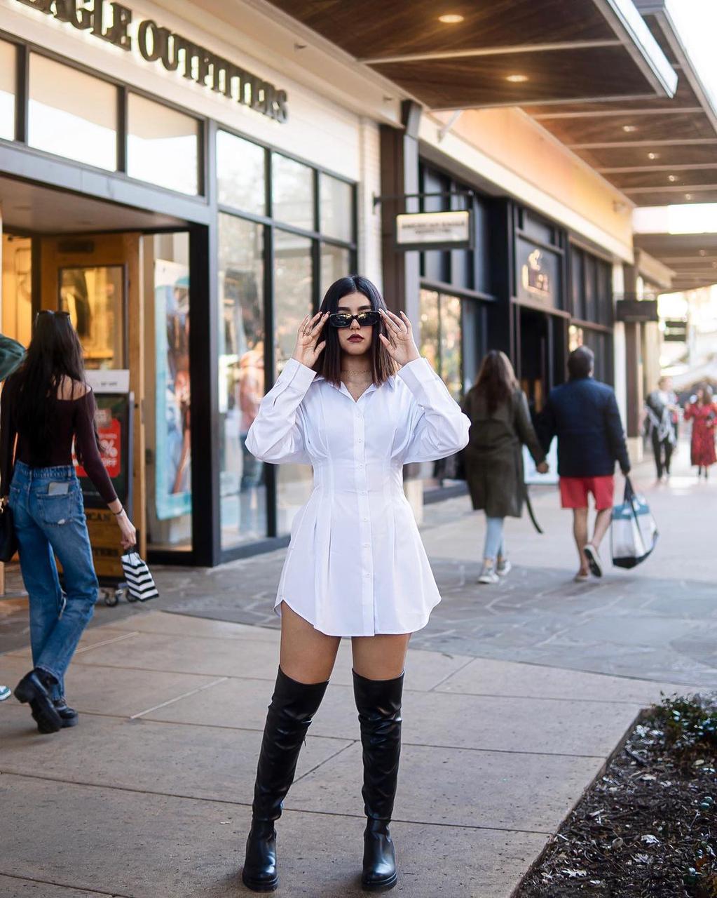 Isn't Andrea just the coolest? This angel wears one of our classic Cider pieces, the Button Down Corset Shirt Dress. We're so down to grab happy hour at Roma with such a fun look! 🥂