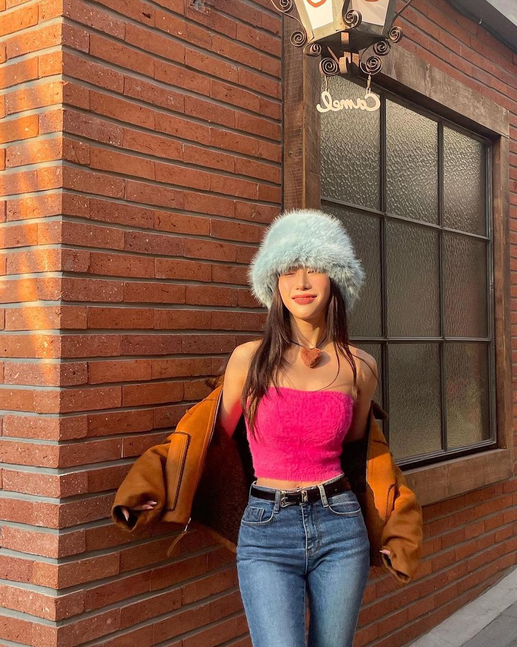 Seomi keeps it cute and casual on the streets of Seoul in our Solid Fluffy Bucket Hat and Solid Fluffy Knit Strapless Crop Top 💞