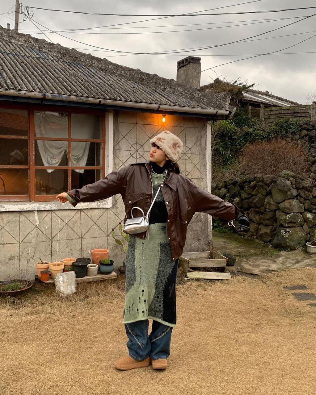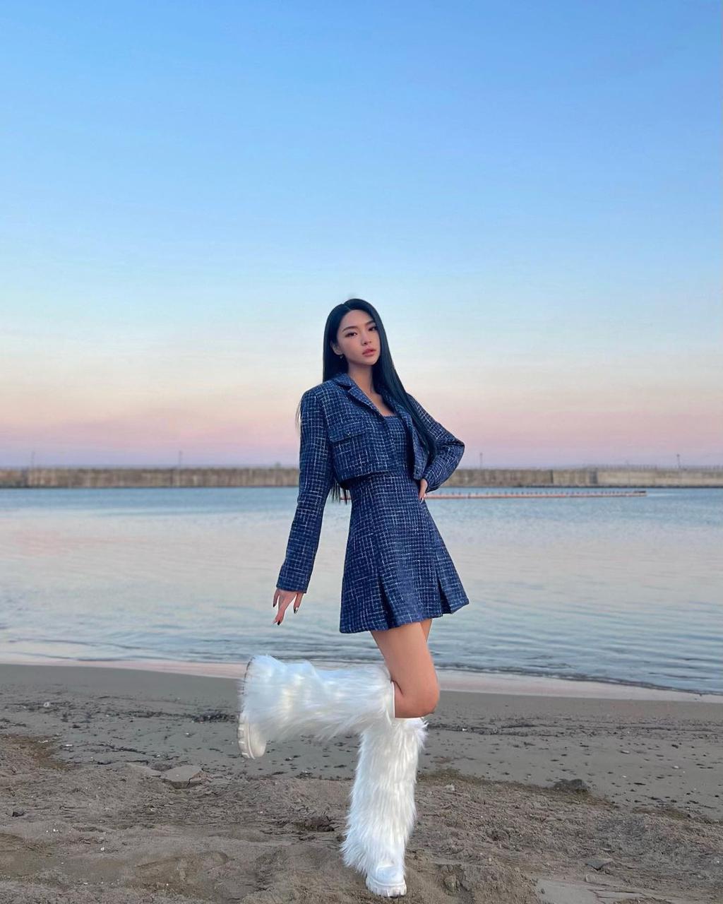 Love seeing Hyeon in her element, catching blue hues to show off her cozy-chic outfit in the city of Daegu! Wearing our Tweed Notched Collar Long Sleeve Crop Blazer, Tweed Sleeveless Split Short Dress, and Faux Fur Fluffy Leg Warmers 🦋