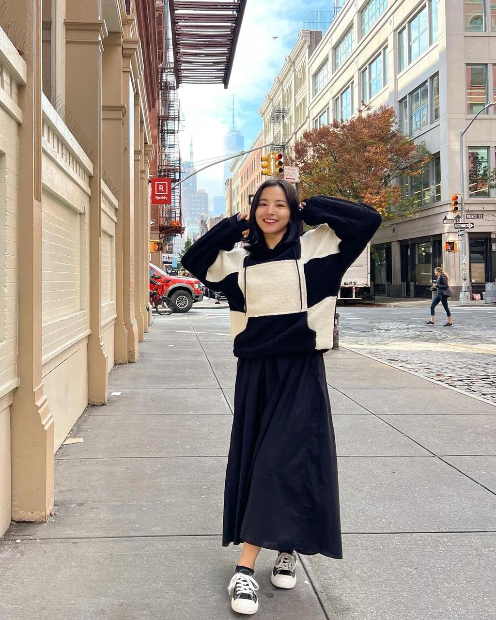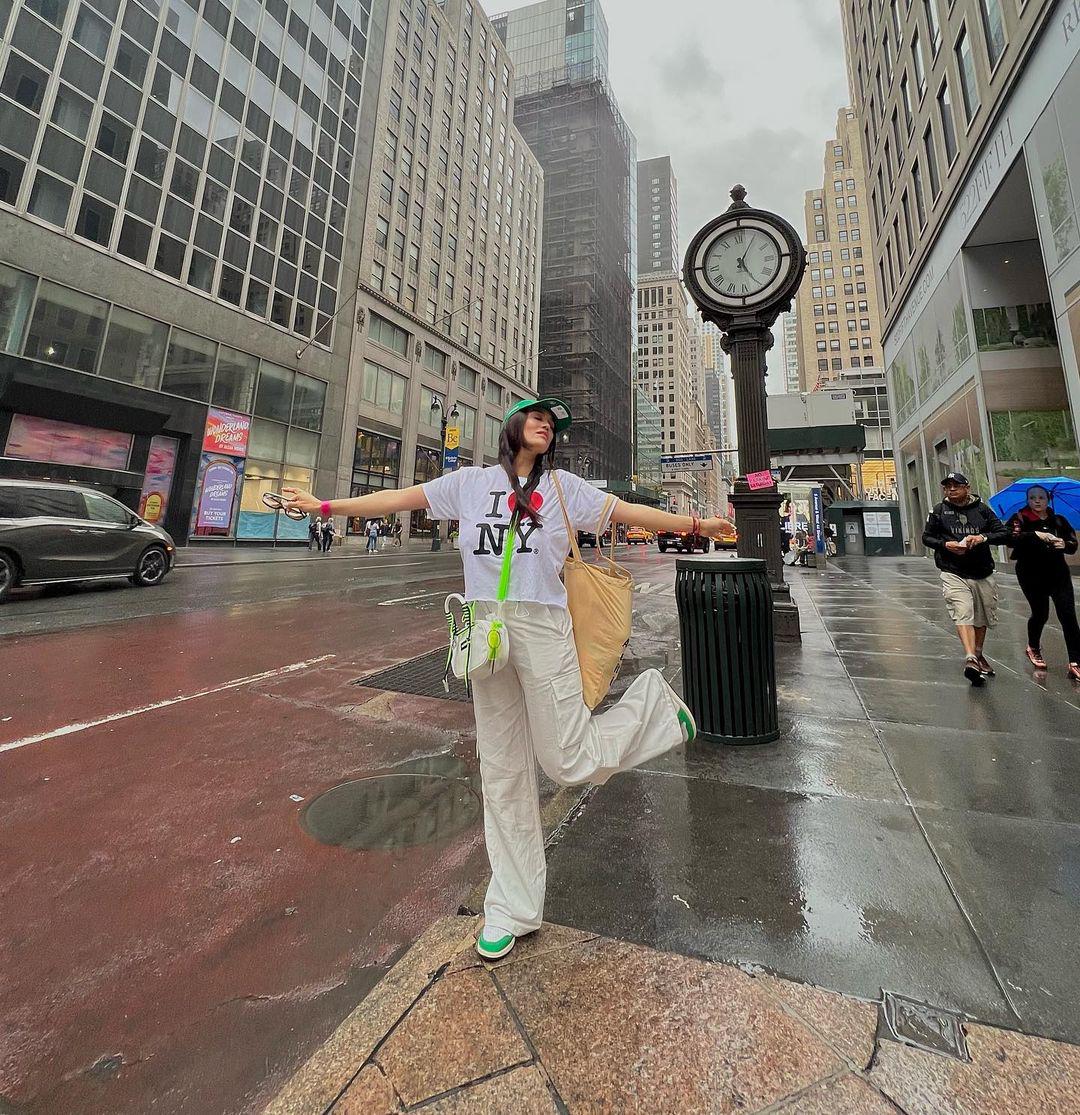 Andrea rocking an iconic I HEART NY souvenir tee with a pair of our neutral trousers! Glowing up 5th avenue even on a rainy day? CHECK ✅