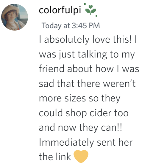 It's messages like this that fuel us to continue growing Cider with you and for you, in as many ways as we can! 🥰