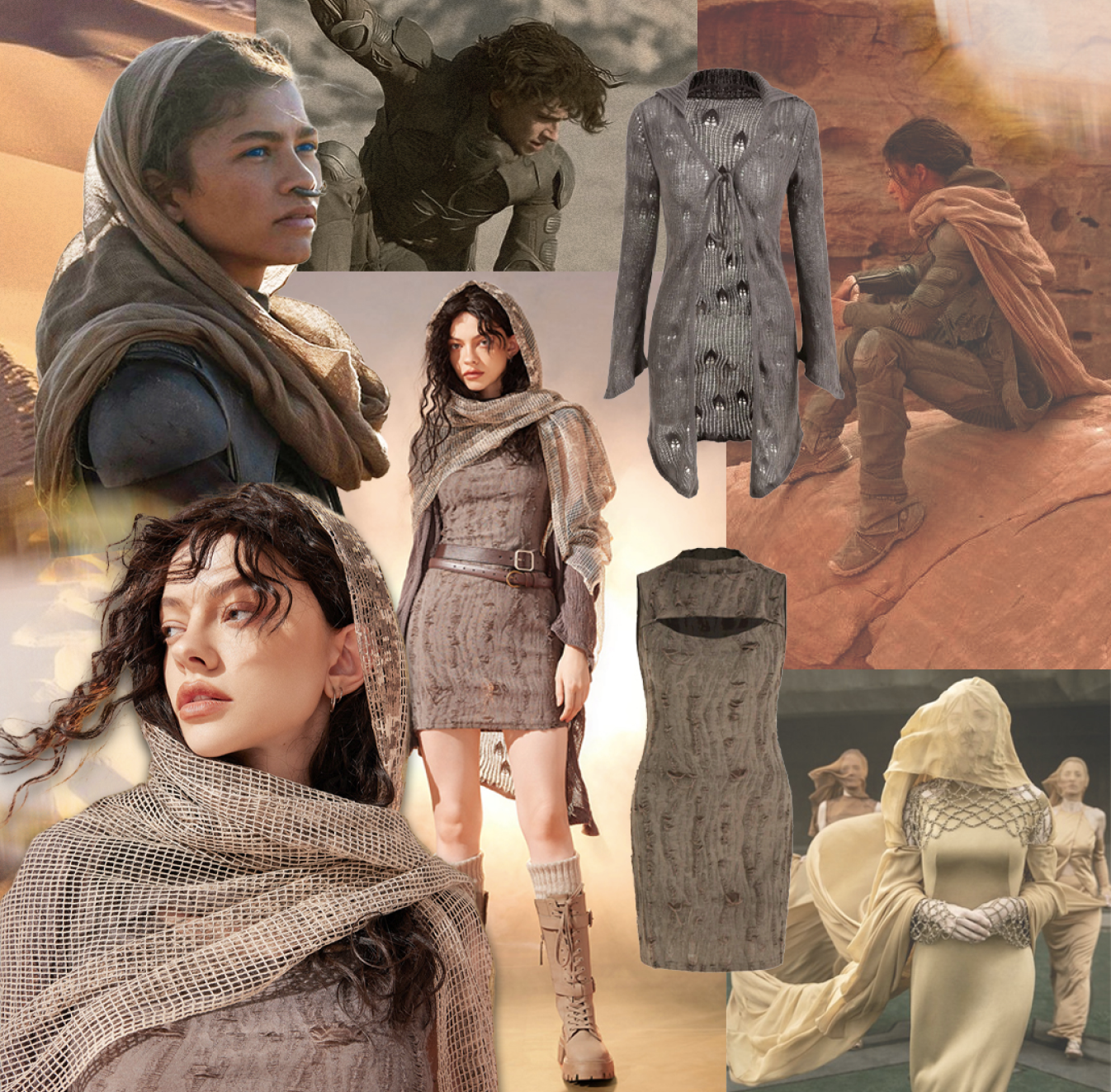 "This is only the beginning..." 👀 The Desert Warrior Costume Dress features a sleeveless fit with a mock neck and a chest cut-out design. With a bodycon fit and a dark grayish brown distressed fabric, this mini dress is iconic and perfect for Halloween. Pair with your favorite head scarf and combat boots to complete the costume 🤎
