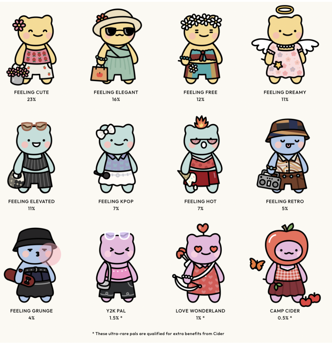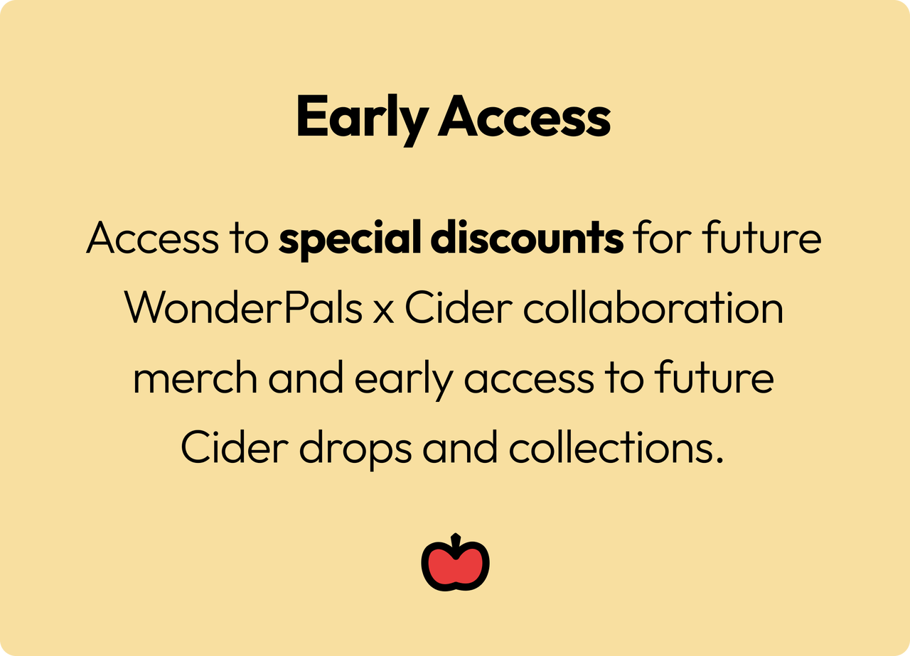 In collaboration with WonderPals, the internet's most adorable pals, we've taken their classic characters and dressed them in iconic Cider outfits! These CiderPal Digital Collectibles will be offered in a limited quantity with some CiderPals being more rare than others – who knows which one you'll get?! 👀