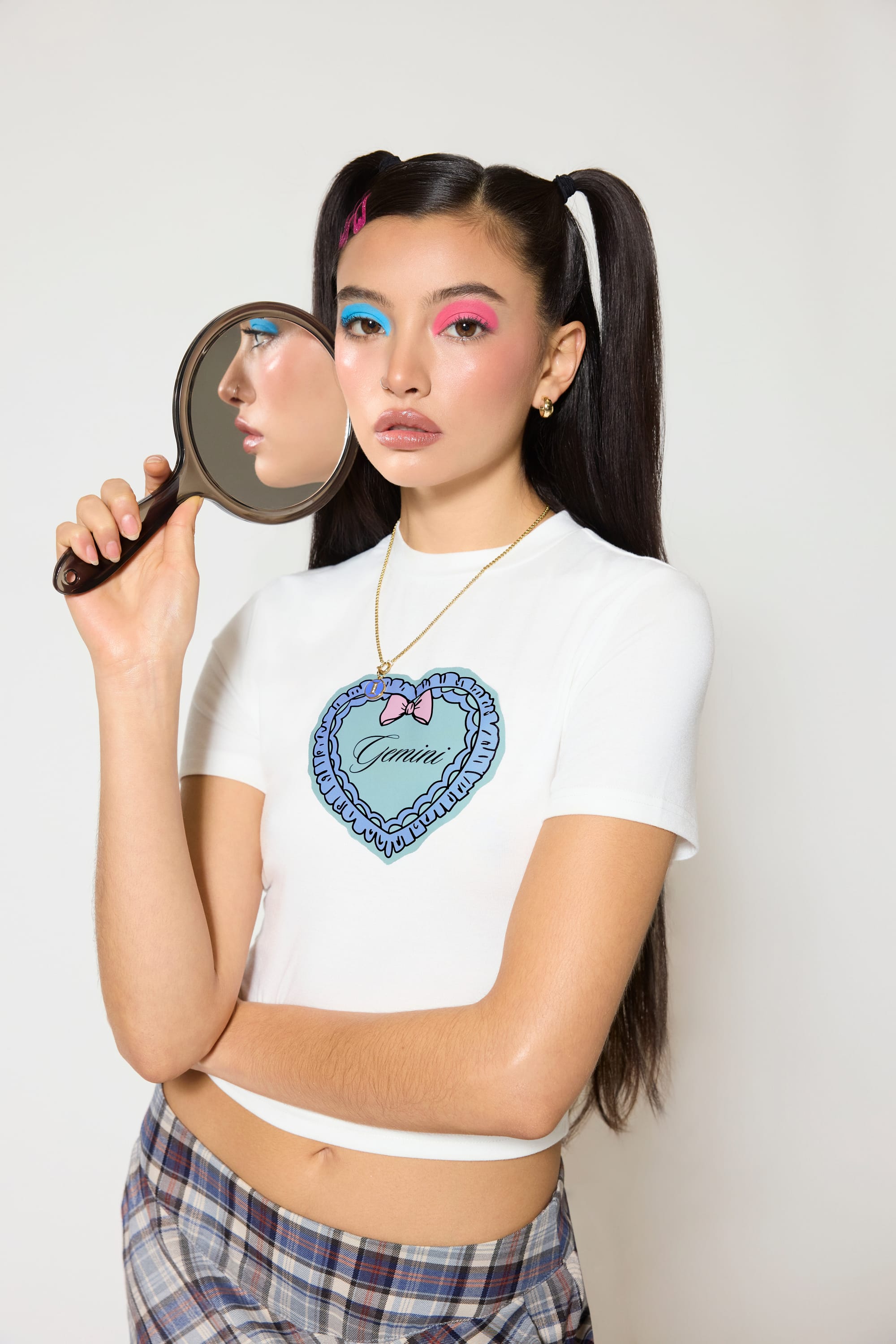 - Gemini: Graphic heart tee ➕ plaid skirt 🟰 playful, versatile, and ready to switch things up 🦋✨. ‼️Add a statement necklace and fun accessories for extra personality!