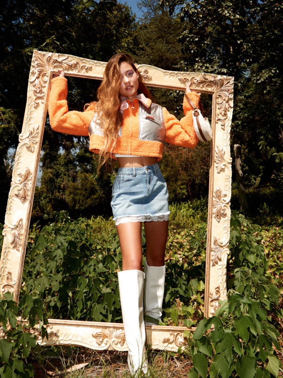 Winter Sunset Sherpa Cropped Coat & Creative Cutie Lace Trimmed Denim Mini Skirt