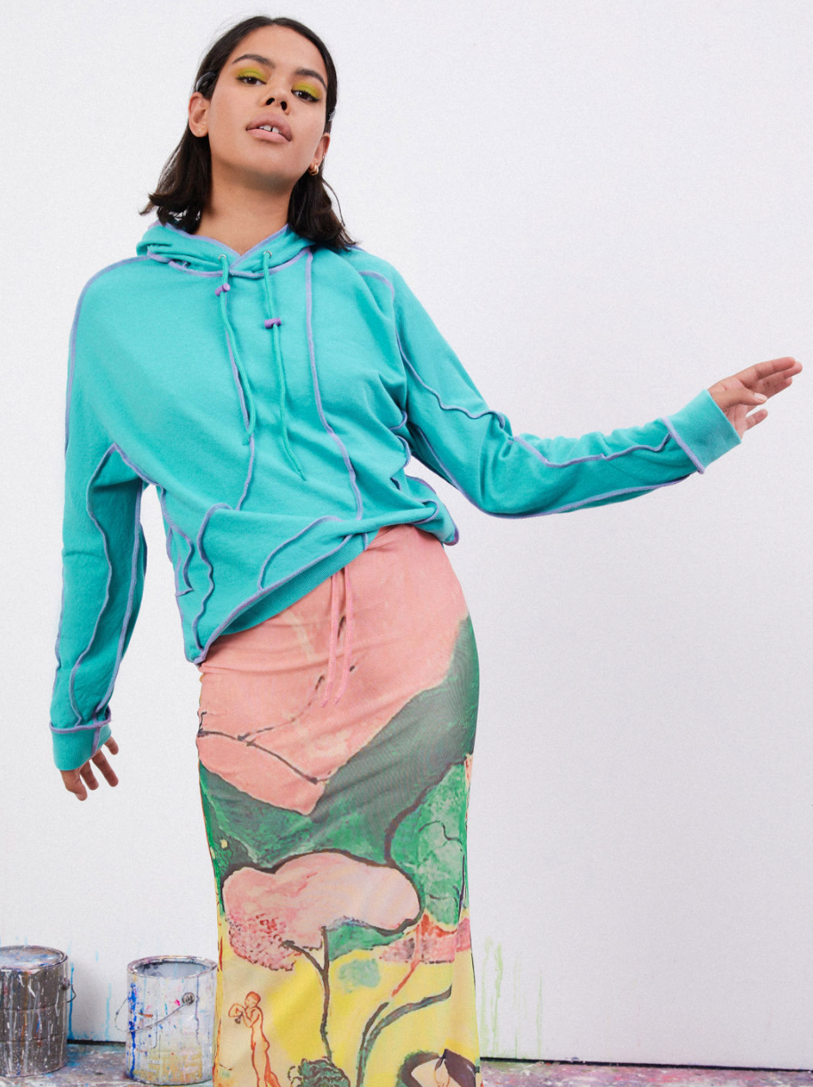 Canvas Lines Aqua Blue Hoodie & "Joy of Life" Printed Midi Skirt